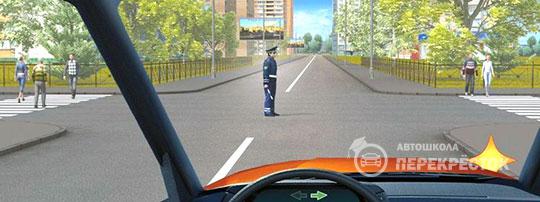 Остановитесь перед перекрестком и дождетесь другого сигнала регулировщика.